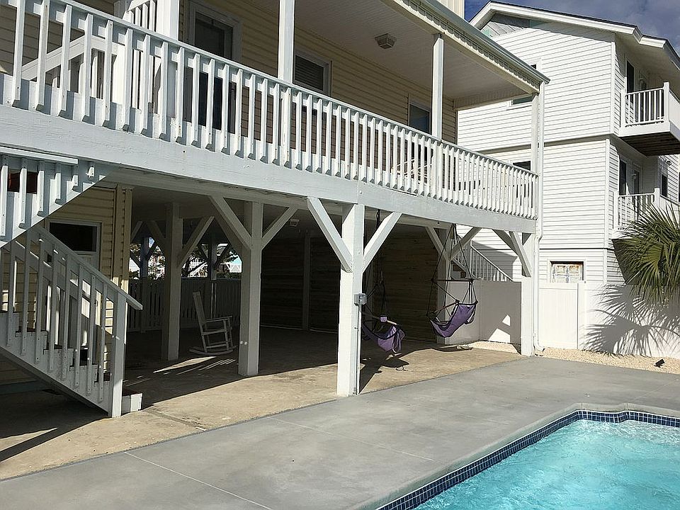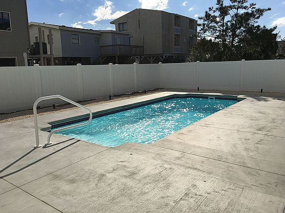 This 4 BR/2 BA home w/ a loft has great canal and ocean views too! Private in ground heated swimming pool! Recent improvements include new central air (2016), front deck stairs and rails (2016), kitchen appliances (2023), washer/dryer (2013), carpets and tile (2010), windows, siding (2008), rear fiber on deck and vinyl railings (2022), new roof and skylights (2022). A short walk to the beach, restaurants and mini-golf. The kitchen has a ceramic tile floor, lots of cabinets, and a breakfast bar. The kitchen door opens to a deck overlooking the in-ground swimming pool and fenced-in back yard. The great room has carpet, cathedral ceiling and a ceiling fan. Each bedroom has carpet and a ceiling fan. Both bathrooms have a ceramic tile floor, shower/tub combination and single sink. Above the kitchen is the loft that leads to a roof-top deck with an ocean view, perfect for catching some rays! Whether you are looking for a second home or investment, this home has so much to offer. Better act quick!