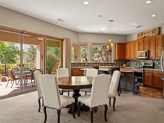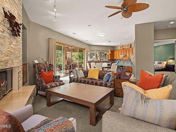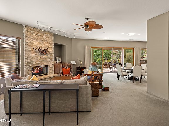 Meticulously maintained and move-in ready, this Sedona Golf Resort home offers an inviting flow with gentle distinctions between spaces, blending comfort and elegance. The open-concept great room features a warm stone fireplace and seamless access to the covered patio—perfect for morning coffee or tranquil evenings surrounded by easy-care desert landscaping. The kitchen shines with durable, stylish countertops, stainless steel appliances, and a custom backsplash. A spacious primary suite provides a large bath and walk-in closet, while the split floorplan ensures privacy for guests or a potential third bedroom/office. Nestled in a quiet cul-de-sac, this home captures the essence of Sedona living—whether you're a golfer or simply seeking serenity and connection to nature.