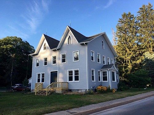 Discover the space you've always wanted in this historical three story home. First floor offers a grand living room, parlor, gracious dining room, relaxing family room with wood stove, updated kitchen, sunroom and mudroom. The spiral stair case leads to a master suite with private bath and three more bedrooms. Third floor is finished and has endless amounts of space. Lovingly restored with new windows, siding, insulation, refinished wood floors and much more. All situated on almost an acre with garage and outbuilding. Zoned Village Mixed Use with endless possibilities. See permitted uses in documents.