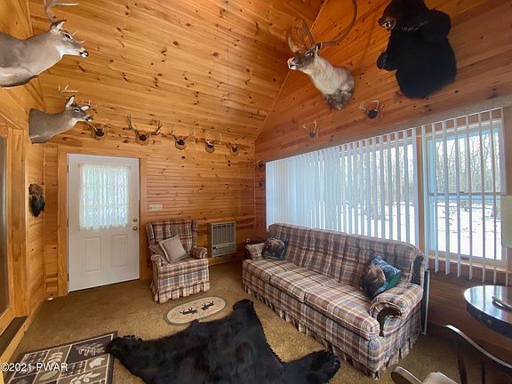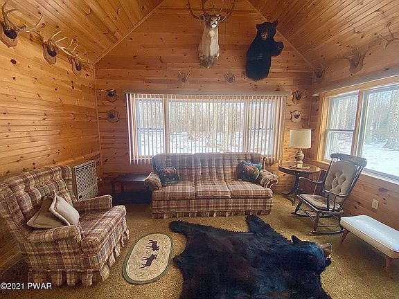 Adorable full time/vacation home in amazing condition. Large master bedroom with a full bath and walk-in closet. Large loft that can be used as a bedroom and entertainment area. Enjoy sitting in the family room full of T/G. Move in ready with lots of storage, including an oversized garage w/ large attic and large shed. Just a minute away from Promised Land State Park where you can hunt, fish, swim, kayak, and snowmobile! Just a short drive to Lake Wallenpaupack. Backs up to a 130 acre parcel. Come enjoy all seasons in this beauty!