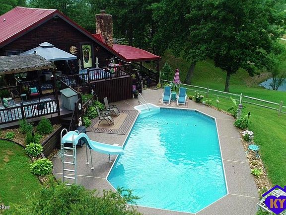 Welcome to 130 Elliott Drive. The home you'll never want to leave! This sprawling log and stone home, situated on over 13 ACRES is like a resort! There is a living room, a great room - both with fireplaces - an open kitchen area with tons of cabinet space, a sitting room, completely enclosed sunroom with hot tub and lounging area with more lounging areas by the in-ground pool! Master suite is on the main level, with 2 bedrooms and full bath upstairs. Multiple out-buildings, including a 30x60 ft ,6+ car garage with a lift and air compressor, storage building and previous chicken coop that would make a great play house or outdoor picnic area. You even have your own pond. Recent updates include carpet, paint, light fixtures and the addition of a master bath. Call today for your private tour