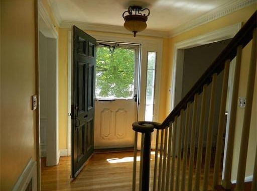 Beautiful Colonial. This very spacious well-built Colonial has classic, original features: a large dining room with half-wall paneling and dentil molding, and an elegant front-to-back formal living room with a dark wood fireplace. The custom kitchen has beautiful maple hardwood cabinets with slide-out drawers for easy access. The kitchen opens up to a huge family room. Both rooms have access to the outdoor deck, which is the full length of the house! The master bedroom has a walk-in closet. Two large bedrooms (one accesses a sizable storage room) and a fourth bedroom with a walk-up, finished attic give you many options for use. Gleaming hardwood floors throughout and recently installed, insulated windows tilt open for easy cleaning. Two-car garage with an expanded driveway. Do not miss this opportunity for move-in ready comfortable living with so much great space to offer.