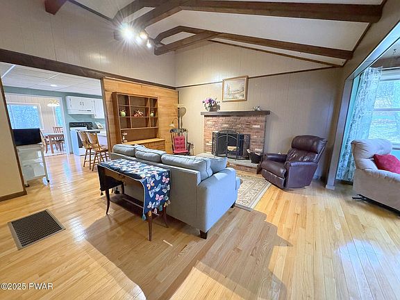 Tanglwood Lakes Custom Ranch combines charm, comfort, and style with an unbeatable location. This home will capture your heart from the moment you walk in! Main-floor living features classic open design, vaulted ceilings, and hardwood floors. 2.5 Baths ; Central Heating & A/C for year-round comfort. Relax on the Sundeck or in the Florida Room, soaking in the beauty of the surroundings and listening to the seasonal stream amongst wooded scenery. Living Room has a full hearth brick fireplace, leading to a front Glass Room with skylights and an Updated Country Kitchen with modern cabinetry. Family Room with office space or crafting room and multiple storage areas off a one-car garage. Paved Driveway for convenience and easy access. The Ideal Corner Location with access to Lake Wallenpaupack--perfect for outdoor enthusiasts! Whether you're enjoying the tranquility of the sundeck or cuddling up by the fireplace, this is the place you'll want to call home. Don't miss out on this incredible opportunity--schedule a tour today!