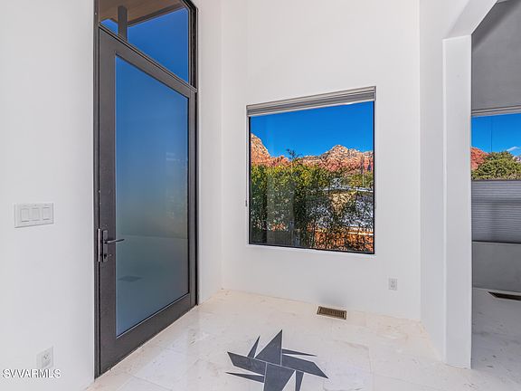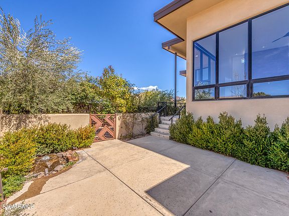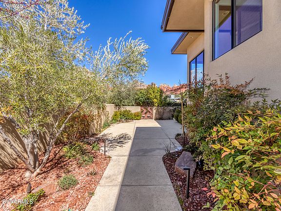 When a professional landscaper turns his attention toward the finishing touches on his own custom-built 3br, 4 ba, 3015 sq ft Smart Home, every detail speaks bespoke design. A decorative metal gate opens up to an inviting courtyard with a stucco privacy fence, olive trees and a captivating water feature. Inside, a spacious study offers a light-filled space for a home office, art studio or library. Soaring ceilings bathe the limestone tiled floors with natural light while framing spectacular red rock mountain views of Chimney Rock, Thunder Mountain and Sugar Loaf, whose trailhead is only an 8-minute walk. A floor-to-ceiling stacked stone gas fireplace flanks the view. The open floor plan's kitchen has soft-close cabinets, stainless steel appliances. Please see supplement for more info. a dual convection oven, gas range, island with added storage and wine refrigerator. A full bathroom, utility room with access to the expertly landscaped, terraced back yard and attached garage are just off the kitchen. The ground-floor master has a large walk-in closet, walk-in shower, dual sinks and outdoor deck. Upstairs, two guest rooms with large closets share a spacious Jack-and-Jill bathroom. The lush back yard features an outdoor shower, custom turf areas, landscape lighting and mature trees, with access to the large bonus office or studio with tile floors and built-ins with display lighting. A spacious two-car garage includes custom cabinets, extra storage, additional laundry hook-ups and its own half-bath. With NO HOA, this gem of a home won't stay hidden for long. Nightly short-term rentals and AirB&Bs allowed.