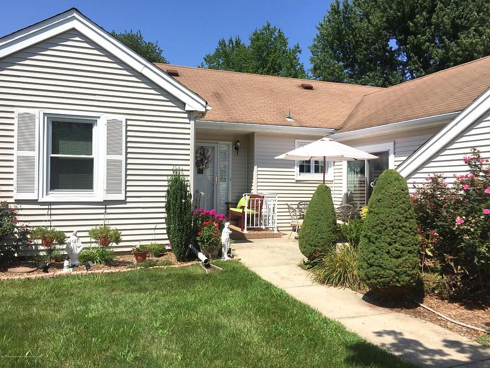 Lovely Sorrento with private and wooded location. Front and Rear Patios. Large kitchen features some cabinets with glass inserts. Spacious dinette with big pantry. Combination Living Room/Dining Room. Recessed Lights. Very bright and sunny home. Wood like floors throughout. Comfortable Sunroom with direct access to garage. Updated items include bathrooms, windows, sliding Patio doors, and new Garage Door. Driveway long enough for two cars. Oversized Paver Patio overlooking private treed backyard. Beautiful baths including stall shower in Master bath with custom tile work.Immaculately maintained. Outdoor furniture included except bench on front step.