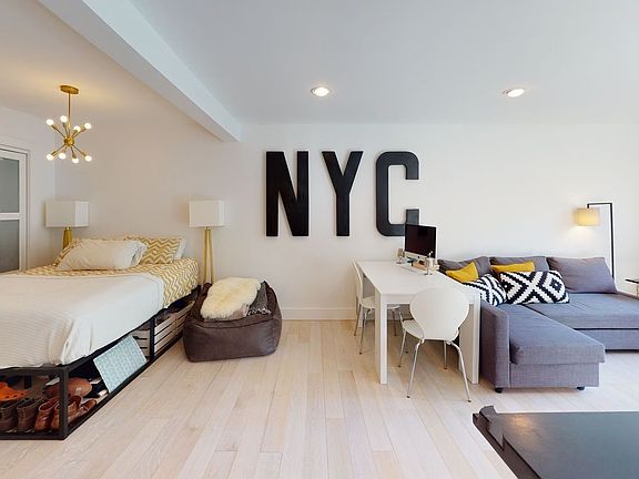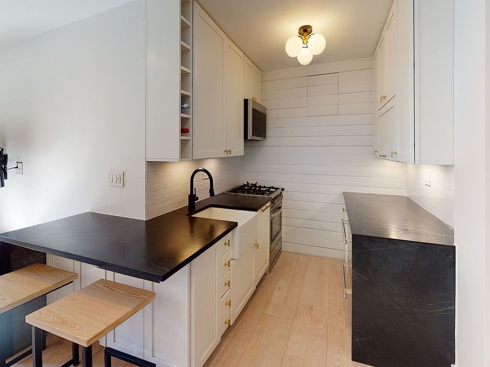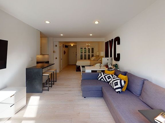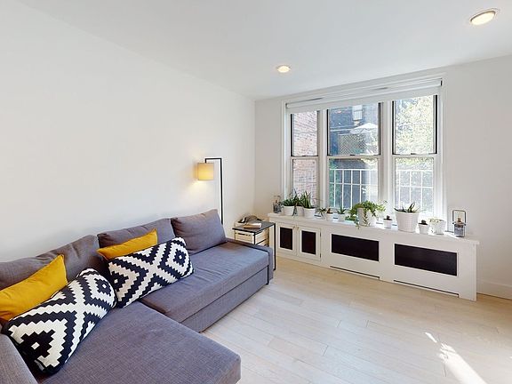Fully renovated with custom high end finishes throughout, this large studio located in Prime Brooklyn Heights is the perfect turn key property to call home. 130 Hicks is an elevator building with a private huge shared garden for shareholders in the building. The recently fully renovated apartment features a modern kitchen that has been completely opened up to the living space, with Italian soapstone kitchen countertop - imported from Italy, white porcelain NYC subway tile inspired backsplash, matte black Moen plumbing fixtures, brushed brass cabinet pulls and drawer handles, brand new fridge, freezer, dishwasher, oven & microwave. The fully renovated bathroom includes Merola Brooklin brick shower tiling and Nero Marquina marble bathroom/shower floor tile - imported from Spain, Handcrafted brushed brass sputnik pendent with 3 other matching flush mount fixtures. With beautiful new 5" wire brushed arctic white oak wood floors throughout & recessed lights with dimmers put in each room, this seamless renovation is perfect for someone who wants to move right in & enjoy the next chapter of their life. Your new home overlooks the building's beautifully landscaped common garden and townhome facades across the way. This elevator building features: A part-time super, laundry, bike rack, pet friendly. Small dogs considered with board approval. Cats are permitted. Flexible sublet policy. Brooklyn Bridge Park, The Promenade, the restaurants & shopping on Montague St, and DUMBO are all super close. The entrance to the 2, 3 subway is around the corner, and the A, C, 4, 5 & R trains are all within a short distance, making transportation extremely convenient (just one stop away from Manhattan). Welcome to your charming new home!
