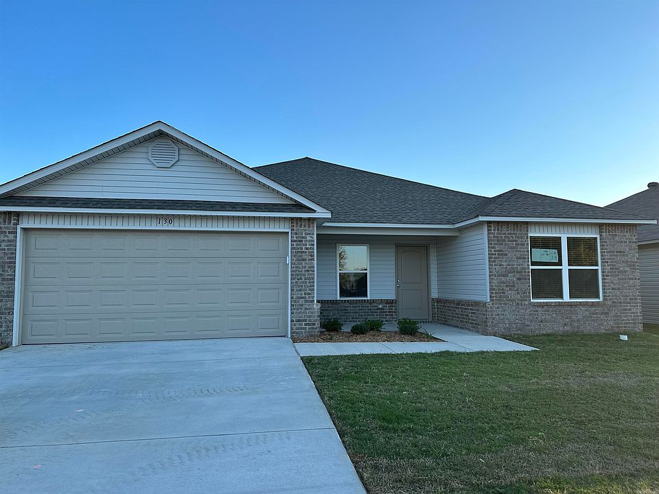 Kinsley Plan is a 4 bed 2 bath home with master suite on one side and guest rooms on other side. Master suite has integrated soaking tub/shower and a double bowl vanity, Luxury vinyl plank in all rooms, covered patio 9 ft ceiling in living areas, and ceiling fans. Seller will provide 2-10 home buyer warranty. Upgrades included in this home: disk lights over bar top, 14x10 covered patio with architectural shingles, architectural shingles, 6/12 radiant barrier, soaker tub/shower combo in Master Bath, toilet upgrade, plumbing faucet level 2, 8" deep sink in Kitchen, door bell, added cable jack, added 110v outlet, HVAC rigid duct upgrade, 16" bar top in Kitchen, Luxury Vinyl Plank flooring in wet areas and Living Room and adjacent hallways and all bedrooms including closets, garage door opener, garage door keypad, enclosed water heater, full vanity width mirrors, faux wood blinds throughout home, Cheyenne style interior doors, Master Closet door, double closet rods in Master, window sills throughout home, 5-shelf pantry upgrade, double bowl vanity in Master Bath, LED disk lights added in Kitchen & Living Room & Master Bath & Bathroom 2, Fluorescent light in garage, ceiling fan in LR.