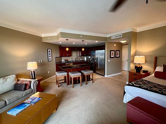 A rare opportunity to purchase an upper floor studio at the Honua Kai Resort and Spa. Hokulani 719 offers huge ocean and sunset views while overlooking the tiki torches situated around the Hokulani pool and Duke’s Beach House. This unit has always been owner managed, so it has always been well taken care of. Listor is the seller.