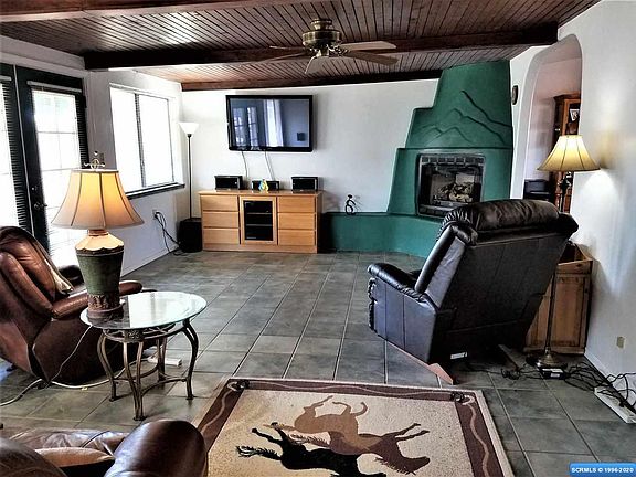 - LIVING ROOM: Blinds, Ceiling Fans, Fireplace, French Door, Beamed Ceiling