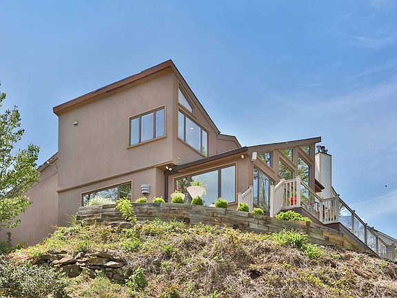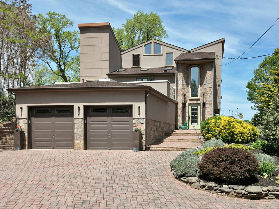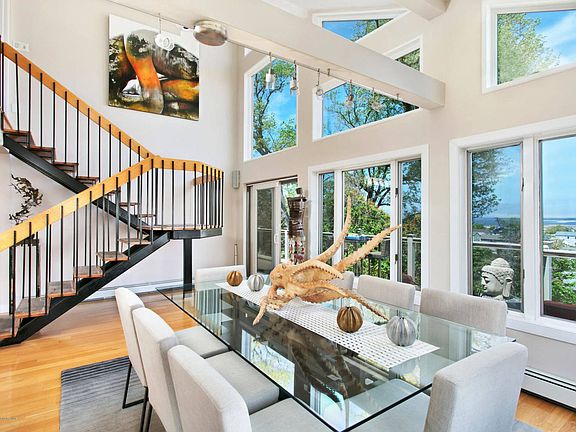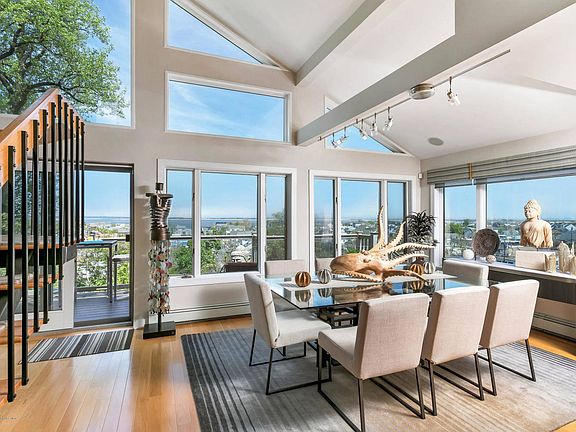 Sophisticated and stunning contemporary hillside home with sweeping views of the NYC skyline, ocean and Sandy Hook beach. Gourmet kitchen with custom cabinets, high end appliances, wine fridge and granite top. Open concept living room dining room perfectly spaced and well designed for any buyer with gleaming hardwood floors perfect lighting and water views. Private master suite with French doors and walk in closet. Complete with home office and luxurious en suite with Jacuzzi tub and separate shower, room with a view! First floor bedroom and full bath. Two more guest rooms and perfectly renovated bath with glass sink and mosaic tiles.