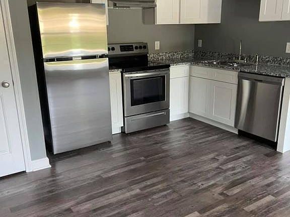The stylish exterior features a mix of stone and wood accents, complemented by a private exterior space perfect for relaxing. Inside, you'll find a spacious living area with hardwood floors and plenty of natural light. The open-concept kitchen boasts stainless steel appliances, granite countertops, and ample cabinetry. Both bedrooms are roomy and bright, with generous closet space, while the modern bathroom includes a combined shower and bathtub. Additional features include central air conditioning, washer and dryer hookups, and parking space. Conveniently located near shops, dining, and outdoor activities, this apartment is perfect for those seeking a comfortable and convenient lifestyle in South Carthage. Contact us today to schedule a viewing!