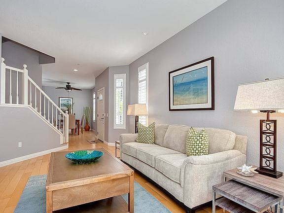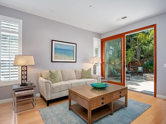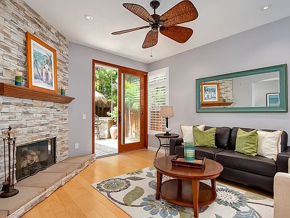 Rarely available beach home located west of the 101, walking distance to Moonlight Beach, Stone Steps and Downtown Encinitas. Immaculate condition and move-in ready! Newly painted inside and out making this home feel bright and open. Upgraded kitchen with stainless appliances, including warming drawer, granite counters, bar seating, rich cabinetry with leaded glass and built-in desk area. Kitchen opens to family room with custom stacked stone gas fireplace and double wood cased sliders that open to backyard. Wood floors and plantation shutters throughout. Large master bedroom and spacious master bath offer a big walk in closet. Convenient upstairs laundry room with storage cabinets. Spacious bedrooms upstairs and 4th bedroom with double-door entry would make fantastic office space. Enjoy the sunny days entertaining in the tropical retreat backyard with hot tub, custom stacked stone fire pit and built in BBQ with palapa. No HOA or Mello Roos.