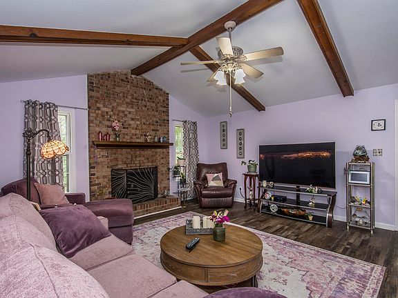 Cozy fireplaceFreshly stained deckEat-in areaStainless steel appliancesFlowering perennialsExposed wood beamsPrivate backyard