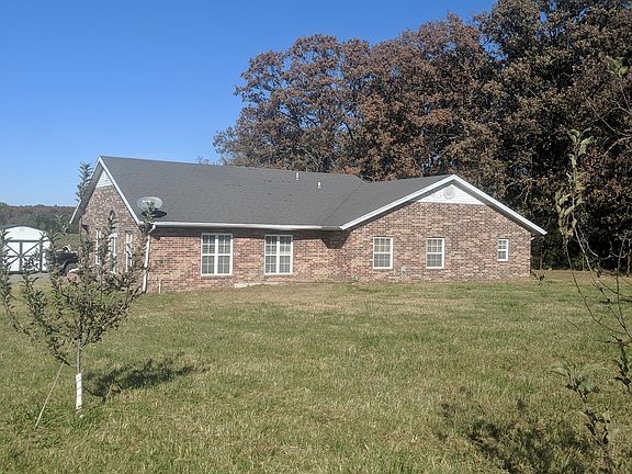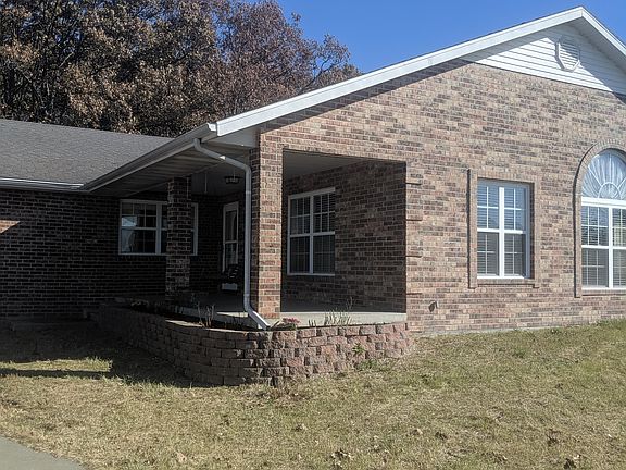 All brick, approximately 2400 square feet of living space with a spacious 2 car attached garage with work cabinets and storage, three bedrooms two of the bedrooms are master bedrooms one has a large walk-in closet with shelves the other one has an adjoining nursery or dressing room with a closet both have adjoining bathrooms has two and a half baths, has some new paint and carpet, also has hardwood floors and tile, has a large living room with a tongue and groove cathedral ceiling with beams, lots of windows has open floor plan with dining area, has a large kitchen with plenty of cabinets and a pantry and another dining area with a bar, house has been well taken care of, has a large stocked pond in front of the house,is located on 5 acres in a very convenient location in town, located with other nice brick homes but is still private with woods behind the house and a farm beside the property, park like setting with a nice front porch, Conway schools for sale by owner 417-664-3252