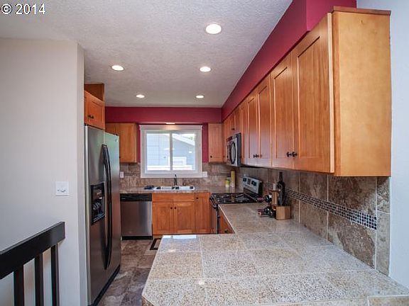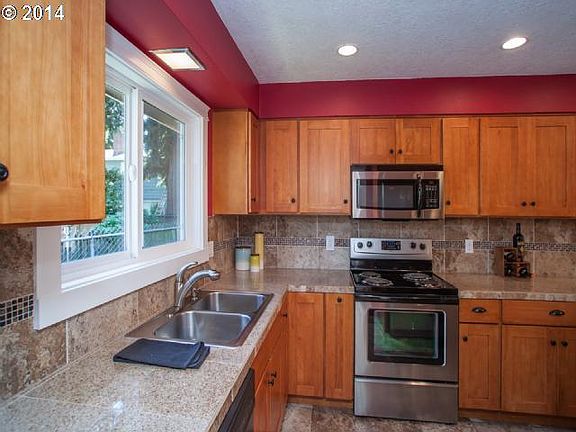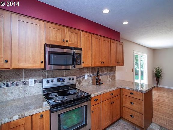 Solid 50's ranch on a quiet cul-de-sac location in the Glendoveer area features recent extensive remodeling and great proximity to Menlo Park elementary (about a half block). Remodeled kitchen with stainless steel appliances, granite counter tops, new cabinet doors. Vinyl windows, 90% gas furnace, nice landscaping. Charming corner brick fireplace in the kitchen /dining/living room area. Bathrooms redone as well