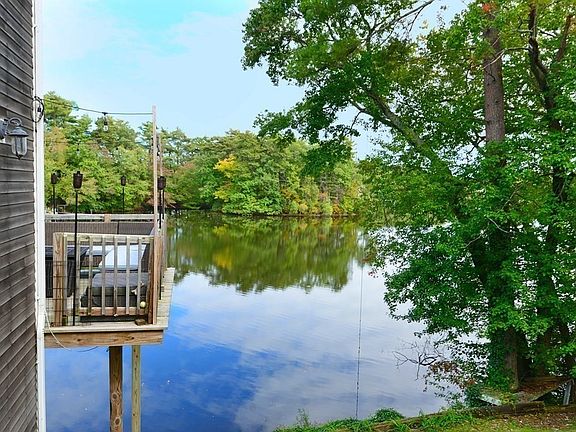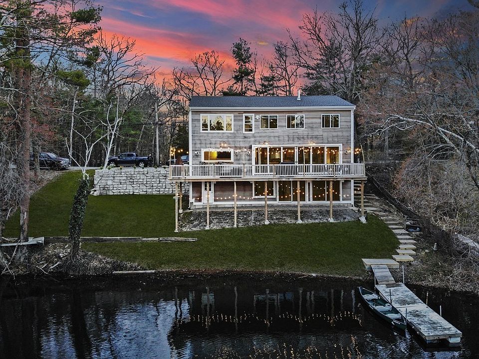 Waterfront home with panoramic views of Bungay Lake. This completely renovated home offers an open floor plan perfect for entertaining all year long while offering a private interior setting. Features include upgraded white lacquer kitchen with GE Profile and Monogram appliances, oversized center island, quartz counters, hardwood flooring throughout, a wall of sliding glass doors opening to an oversize deck, dining room with window converting to deck bar, finished walkout lower level with bar. Second floor hosts there large bedrooms, master with gas burning fireplace and oversize walk in closet, spacious bath with soaking tube, dual sinks, radiant heated floors, and open dual shower area. Updated heating system with central air. Amazing lake views, yet minutes to routes 485 and 95, shopping and schools. Vacation all year long.