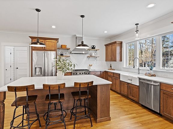 Here’s your chance to own a stunning, modern farmhouse built in 2019 by a renowned builder. This home offers all the features you’ve dreamed of! Enter through the shiplap mudroom into a spacious, open floor plan. The chef’s kitchen boasts rustic hickory cabinets, a large island, subway tile backsplash & floating shelves around the Viking gas range. Relax by the gas fireplace w/ live edge mantle in the family room. Barn doors add privacy to the 1st floor office, which can double as a bedroom. A bathroom with a shower on this level ensures guests have everything they need. A sunny dining room completes the main floor. Upstairs are four spacious bedrooms with hardwood floors. One is en-suite, two share a Jack-and-Jill bath & the primary suite has a luxurious bath w/ a tile shower and soaking tub. Finished lower level offers a retreat area, half bath, storage, and workspace. The oversized garage fits more than two cars & the fenced yard is peaceful yet minutes from Rt 3 and Burlington!