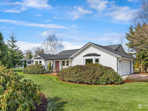 Beautiful one level home w/views of the Olympic Mountain Range. Desirable Neighborhood w/appealing homes on large lots! Beautiful refinished hardwood flooring in the living room, dining room & family room. Vaulted ceilings & large windows for bright interior. Living Room offers a propane fireplace w/built-in shelves. Primary suite walk-in shower, ample storage & walk-in closet. Enjoy all four seasons from the enclosed sunroom. Covered southern facing front porch to enjoy the views. Mature native landscaping for privacy. Private backyard w/ fountain and gazebo. Attached Two-car finished garage. Energy efficient heat pump & hot water tank.