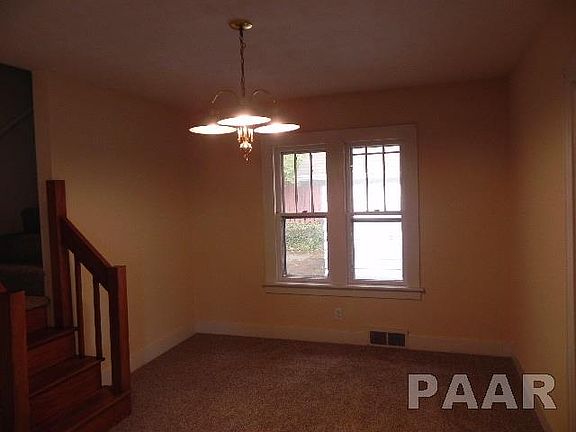 Charming brick bungalow with woods behind home for added privacy. Two bedrooms on main level, and the possible two bedrooms upstairs shares the 2 closets. New roof, carpet, paint and AC.