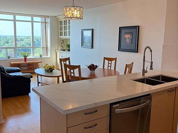 Beautiful Sun-Filled and Bright Unobstructed 1 Bedroom, 1 Bathroom Unit at Derby Tower in Prime Highly Accessible and Desirable Location. Unit has been updated. Enjoy modern kitchen with brand-new quartz counter top & backsplash, new stainless Steel Appliances, Brand-New Bathroom Vanity And Counter, freshly painted throughout and much more. Living room has a nook with a wood panel accent wall perfect for working from home. Oversized walk-in closet in the primary bedroom. Quiet Building with Great amenities including gym, Sauna, party room, 24hr concierge, ample visitor parking, short distance to Fine restaurants, shopping center, grocery stores, Highway 407, 404 & viva public transportation. Heat, hydro, water, and 1 parking space included in maintenance cost.