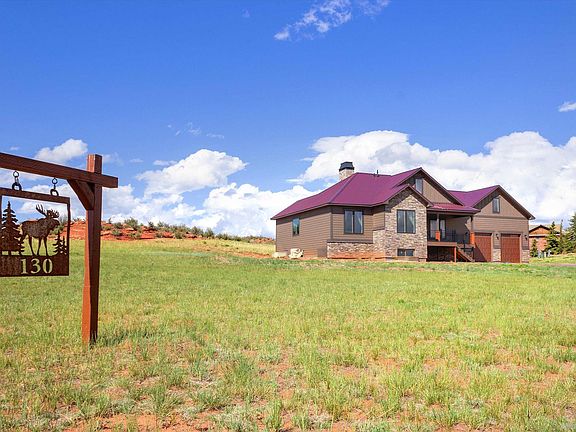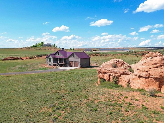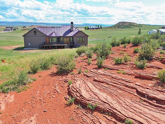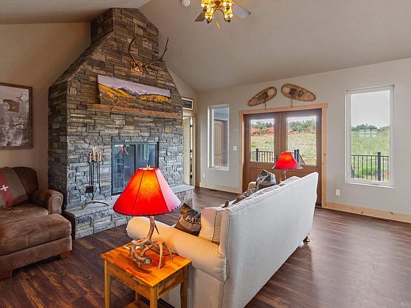 With stunning snow-capped mountain views, this magnificent home is nestled amidst majestic rock outcroppings with stunning. Beautiful knotty alder French doors lead to a versatile den or dining area, and a finished bonus room offers additional living space with its own incredible views. A charming covered front porch welcomes you, while a spacious back deck provides the ideal spot to soak in the serene surroundings. The heart of the home is a magnificent, central stone wood-burning fireplace. Imagine curling up in the corner by the fire, next to the built-in bookshelves, lost in a good book. Enjoy crisp autumn evenings and cozy winter days, all within a home designed with a warm, inviting seasonal scheme. Best of all, this exceptional property encompasses 11.81 acres of unparalleled natural beauty. It includes a spacious 3.08-acre lot along with an additional 8.73 acres of interest in the common area and also borders BLM land, giving you unparalleled access to abundant wildlife and endless outdoor adventures right from your doorstep. Step inside and feel instantly at home. The rich, knotty alder trim throughout adds to the cozy, rustic feel. Large picture windows frame breathtaking vistas from every room, flooding the home with natural light. The chef's kitchen is a dream, featuring a gas range, stainless steel appliances, a large sink, and beautiful quartz countertops complemented by hickory cabinets with crown molding. At the end of the day, retreat to the beautiful master suite, complete with a private en-suite bathroom with a large tub to soak in while admiring the view, with a convenient pocket door for ultimate privacy. Built with durable 2x6 construction and extra insulation, this home is designed for comfort and efficiency, while the striking burgundy metal roof adds a touch of character. The attached garage boasts 9-foot doors, and the unfinished basement, with three egress windows and plumbing stub-outs available for a future bathroom, provides a blank canvas for you to create the space of your dreams. Don't miss the opportunity to experience this incredible property. Contact your favorite Realtor today to schedule your private showing! (NOTE: THE HOA IS $400 PER YEAR.)