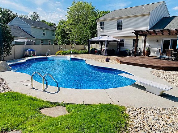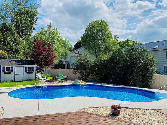 Are you looking for a well maintained home with a pool and a private retreat? This is it! It has a raised custom deck with a Pergola, a cabana and built in lighting surrounded by professionally landscaped pavers leading to~an inground salt water pool featuring a waterfall and diving board. You will love entertaining in your retreat with a~6ft privacy fence, firepit, mature landscaping and a sprinkler system. The home offers Brazilian hardwood floors on the main level, vaulted ceilings and a gas fireplace in the family room, an updated kitchen with stainless steel appliances, granite counters, and a pantry. It also has another room that could be used as a formal dining room, office or living room. The finished lower level has a huge bar to keep the entertaining~going. The second floor has three nice sized bedrooms and two full bathrooms. This house really does have it all!