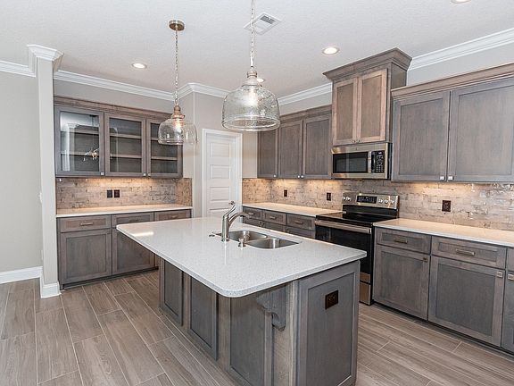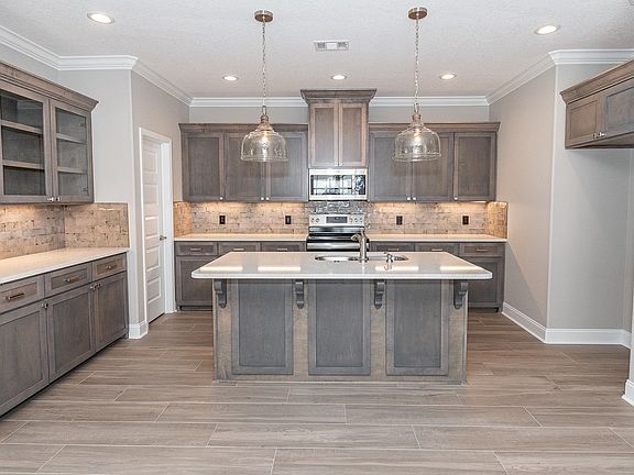 Step into this open floor plan with sweeping views of the lake. All living areas have tile floors and crown molding. The large kitchen has stainless steel appliances, quartz counter tops, a walk-in pantry and custom wood cabinets. The over sized master suite features a separate tile shower, large soaking tub, 2 walk-in closets, and dual vanities. The garage is finished in T1-11 wood paneling on the walls. The large outdoor living space offers great place to relax with nice views of the pond. The HOA includes lawn care, irrigation, and access to the pool and fitness center.