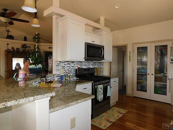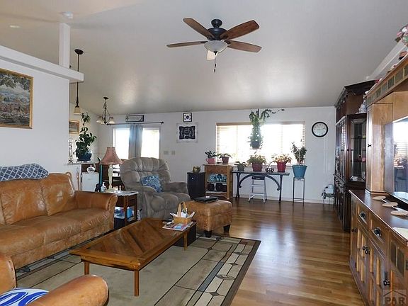 One level living with this beautiful 3 bedroom 2 bath practically new Pueblo West home. Beautiful hardwood flooring throughout the living room, dining room and kitchen. The kitchen features granite countertops, with an eating area, mosaic tile backsplash, stainless steel gas range oven and built in microwave. Both bathrooms and the laundry room have tiled floors. Guest bathroom has granite countertops and safety bars are installed. All 3 bedrooms have carpet flooring. Master bedroom has a window seat with the bay window for storage, a walk in closet with built in shelving. Master bath has granite counter tops, a walk in shower and double sinks. This home sits on 1.01 acres. Xeriscaped lot with some trees for shade with drip and sprinkler system. Views of Pikes Peak, a fenced garden area and a privacy fenced yard with a covered patio. Fenced area has a drive out and walk out gate. Refrigerated Central Air, Natural Gas heating, Tankless water heater, RV Hookups including hot and cold water and parking available. There 400 square foot outbuilding for storage or work shop with electrical outlets and wiring ready to be hooked up for power. Large 3 car 26' garage and circular driveway in the front as well. Don't pass this home up schedule your showing today.