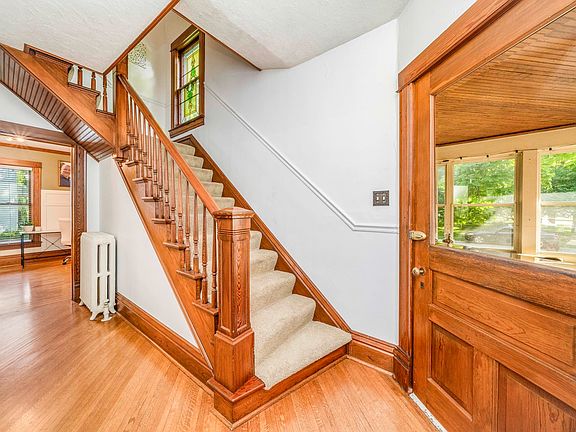 This Victorian-style home seamlessly blends traditional charm with modern updates, creating a perfect balance. The kitchen underwent a stunning remodel in 2019, featuring white shiplap walls, a farmhouse sink, a breakfast bar island, new cabinets, and elegant quartz countertops that exude country-style charm. The meticulous attention to detail that graced the kitchen extends to both bathrooms, ensuring they are equally stylish and modern. The house comprises four bedrooms, with a spacious master bedroom on the upper level boasting dual closets, one of which is a generous walk-in. The fourth bedroom, conveniently located on the main floor, currently serves as a home office. Natural light floods the inviting living room through a bay window, creating a warm and welcoming atmosphere. The formal dining room showcases a beautiful built-in buffet crafted from the original kitchen cabinets, adding character and functionality. The front porch, cherished year-round by the owners, is versatile, comfortably equipped with a window AC unit in the summer and a small space heater in the winter. Preserving its timeless appeal, the home retains all its original woodwork, including trim, doors, hardwood floors, and stained glass windows. Efficient and cozy boiler heat is complemented by central air conditioning provided by an upstairs air handler. A spacious deck, recently repainted, beckons outdoor entertainment. Situated on a corner lot, this home enjoys a prime location. It's a delightful blend of classic and modern features, making it an appealing choice for those who appreciate the enduring charm of Victorian-era homes. A personal visit is a must to truly appreciate all that this home has to offer.