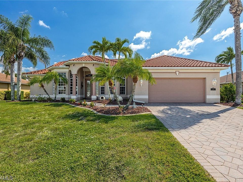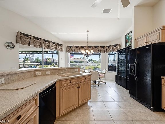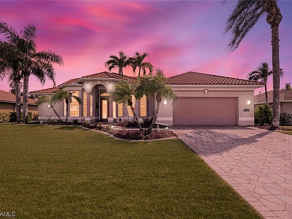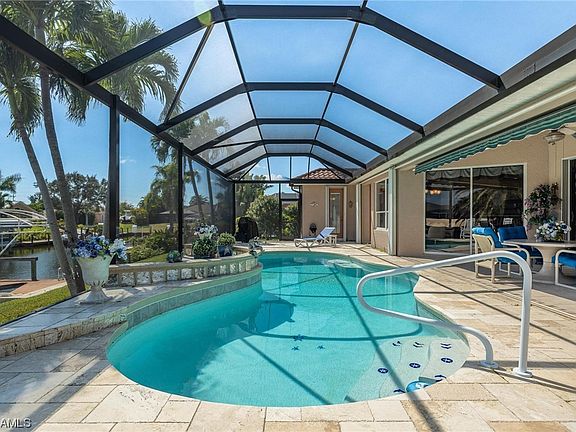 Welcome to PARADISE! This beautiful GULF ACCESS POOL HOME offers 3 Beds + Den, 3 FULL BATHS, and a spacious open floor plan. It was formerly a model home for Villa Homes with Southern Exposure. The kitchen features custom cabinetry, a Reverse Osmosis system, and a whole-home water softener. Vaulted ceilings grace the great room, while the master bedroom boasts a tray ceiling with elegant lighting and French doors leading to the lanai. One guest bedroom is an ensuite and also has access to the lanai. Custom light fixtures illuminate the entire house, including the yard and lanai. The Master Bedroom and Bathroom have been tastefully remodeled with dual sinks, a walk-in shower (ADA ACCESSIBLE), a soaking tub, and his and her walk-in closets. Relax by the pool on the large lanai with Travertine surrounded by mature landscaping. The pool has a beautiful mosaic tile finish and a composite dock with a 10K lb boat lift. Safety is ensured with impact windows, accordion and electric hurricane shutters, and a recently upgraded garage door. Other updates include a BRAND NEW $72K METAL TILE ROOF (2023), a LANAI, POOL CAGE & SCREENS(2023), and a 5-ton AC System (2020). Enjoy stunning sunsets on your dock, embracing the best of SWFL living in this lovely retreat. NOT IN A FLOOD ZONE!!!