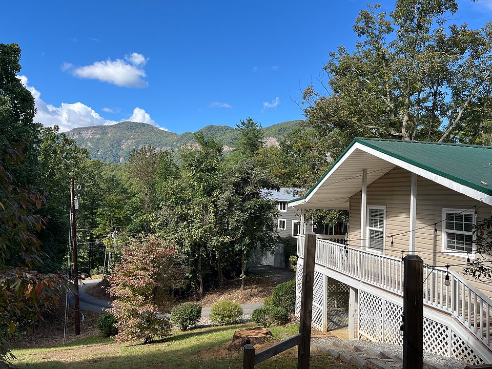 It is 1,058sqft, two newly painted bedrooms, two bathrooms, a remodeled Kitchen, a large wrap-around porch with rocking chairs to enjoy year-round mountain views of Rumbling Bald Mountain, and winter views of the lake (reopening in May 2026 following Hurricane Helene damage).