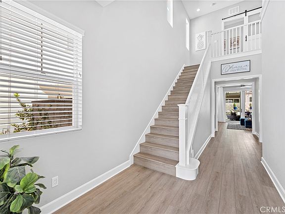 Luxury Reigns in this masterfully designed floorplan in the coveted Sterling neighborhood of Rancho Mission Viejo. Luxury vinyl plank floors grace the entire first floor and lead you into the stunning interior with 10’ Ceilings and luxurious upgrades including cased doorway openings, shiplap in multiple locations, custom built-ins, gas fireplace, 3 Panel Stacking Doors with screens, surround sound and many smart home features. Beautiful custom millwork including hallway casings, shiplap walls surrounding the fireplace and first floor bathroom and custom barn doors. Kitchen appointed with White Shaker Cabinets with soft close and Cabinetry to the ceiling, porcelain farm sink and farm faucet, oversized white subway tile backsplash, Bosch stainless steel appliances, marble look quartz island with bar seating and beautiful nickel pendant lights. The adjacent dining room is large and flanked by one of the stacking doors and beautiful chandelier. Down a hall is a bedroom and full bath with step in tiled shower, ship lap wall, cantilevered mirror and oversized pendant light. Upstairs the impressive Master Suite has surround sound, ceiling fan, recessed lights and custom barn door to ensuite bath with huge walk-in closet, oversized tiled shower, large soaking tub with quartz decking, quartz counters and framed mirrors. Large loft space makes the perfect second living room or playroom with upgraded staircase, surround sound, ceiling fan and recessed lights. Two secondary bedrooms with recessed lights, ceiling fans and upgraded carpeting. Both have their own bath, one is an ensuite and one is a hall bath, with quartz counters, tub/shower combo and glass shower enclosures. Custom barn door with glass window to laundry room with large folding counter, boho tile floors and included washer and dryer completes this floor. Downstairs this open floor plan is perfect for entertaining with the oversized stacking doors creating a seamless flow for indoor-outdoor living into the backyard with a built in polished concrete BBQ island, 2’ planter wall, fountain with beautiful tile work, pie shaped side yard with turf lawn and aluminum patio cover. Illustrations and designs for a small pool are completed and can be provided. This well appointed home also has 12 Panel OWNED SOLAR System, 2 Whole House Fans and Whole House Water Softener. The 2 Car attached garage upgraded with epoxy floors, custom cabinets and 4 overhead racks completes this amazing home! Welcome home to RMV!