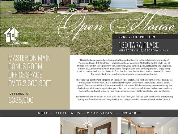 Well-established community of Plantation Chase, 130 Tara Place is a traditional home conveniently located on the north side of Milledgeville and in close proximity to Lake Sinclair, area schools, parks, restaurants and shopping. Built in 2003, this home features a functional floorplan with over 2,600 square feet. Spacious master bedroom on the main floor with double vanities, two walk-in closets, and separate shower & garden tub. Upstairs features an additional bedroom and full bathroom. This home is very accommodating. Features additional sought-after space that can be used as an additional bedroom or used as a home office. Work remotely from the comforts of your home when necessary.