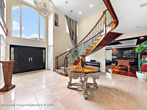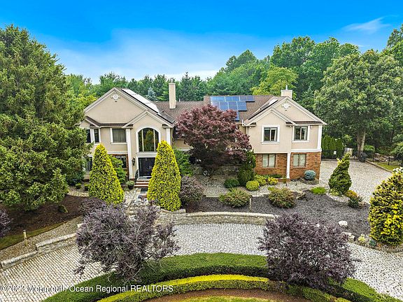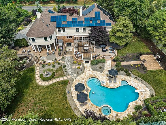 Welcome to this exquisite custom home. Starting with its secured gated entry, this stunning residence offers a luxurious and unparalleled living experience. Boasting an impressive array of features and amenities, this home is truly a masterpiece of architectural design and craftsmanship. With 5 bedrooms, 4 full bathrooms, 2 half bathrooms, and over 5,400 square feet of living space, every inch of this home has been meticulously designed to offer the utmost comfort and style. This extraordinary residence has been awarded the Gold Award by the American Society of Interior Design for its exceptional residential space, showcasing the highest standards of design excellence. As you step inside, you are greeted by a double-story foyer, setting the stage for the elegance that awaits you throughout the home. The attention to detail is evident, with exposed brick accents that add a touch of character and charm. The expansive chef's kitchen is a culinary enthusiast's dream, featuring two islands, perfect for entertaining guests. Equipped with top-of-the-line appliances, including a Viking stove and oven with a pasta filler, a breakfast griddle, and a built-in espresso machine, this kitchen is sure to impress even the most discerning chef. The adjacent breakfast/dining nook, complete with a wine fridge, offers a cozy space to start your day or unwind in the evening. The den provides a warm and inviting atmosphere for relaxation or casual gatherings while the theater room is perfect for hosting movie nights or game days. The primary bedroom suite is a true sanctuary, featuring a sitting area, built-ins, and a two-sided fireplace that adds a touch of romance and sophistication. The en-suite bathroom is a spa-like retreat, complete with a luxurious soaking tub, a spacious walk-in shower, and a massive walk-in closet that offers ample storage space. The lower level of this home is an entertainer's paradise. The basement boasts a wet bar, a full bathroom, and a kitchenette with a separate bedroom, providing flexibility and convenience for hosting guests. The walk-out access ensures a seamless flow between indoor and outdoor spaces. Outside, you will find a meticulously landscaped oasis that offers an abundance of recreational options. The built-in koi pond adds a serene touch to the surroundings. The saltwater pool offers a refreshing escape during the summer months, and the basketball court provides the opportunity for friendly competition. The built-in outdoor kitchen, complete with a refrigerator, a warming drawer, and more allows for effortless outdoor entertaining. The fire pit is perfect for cozy evenings spent under the stars, creating unforgettable memories. In addition to its impressive features, this home is located within the sought-after Holmdel school district, ensuring an excellent education. Its close proximity to transportation options makes commuting a breeze, while the nearby shops, restaurants, and the renowned Bell Works complex offer a wealth of convenience and entertainment options.