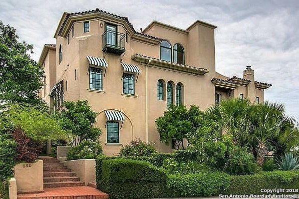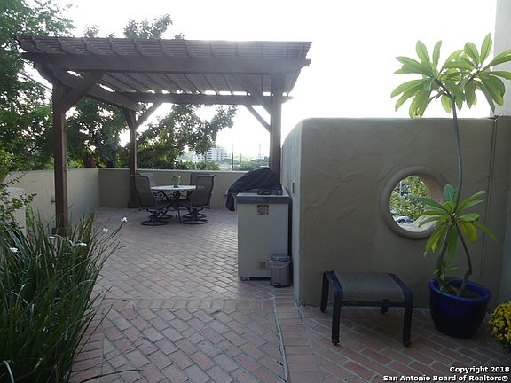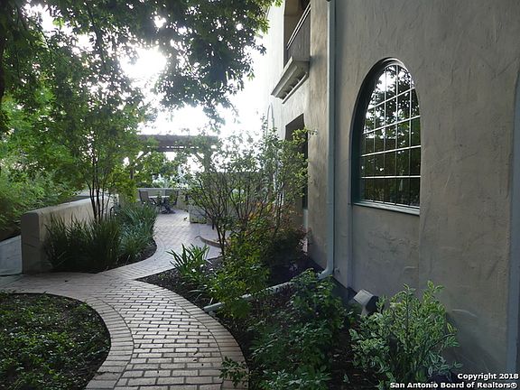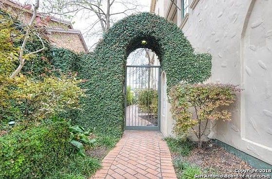 Sophisticated end unit condo located in Alamo Heights. High end features with custom cabinetry, 9" crown molding throughout, hardwood flooring, and built in wall unit. Flexible floor plan allows for master B/R to be upstairs or down. Gourmet kitchen with many cabinets and large pantry. Custom built dry bar. Oversized arched windows with views of secluded greenspace. Wonderful brick patio, private and deeded to the unit, with arbor and built in gas grill. Walk to Central Market and restaurants.