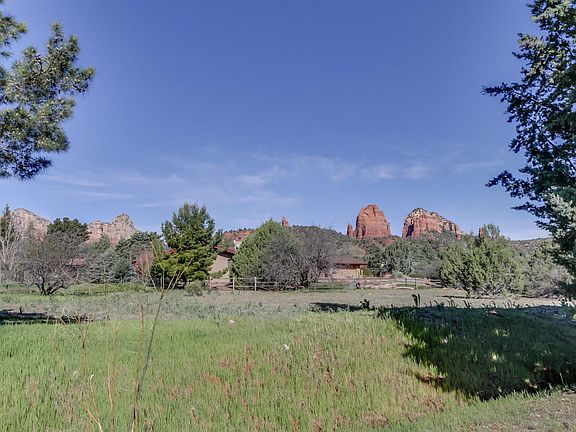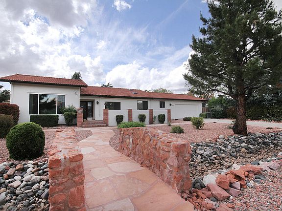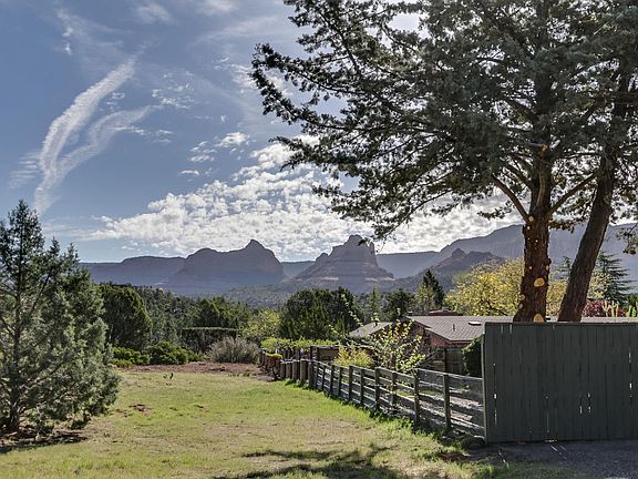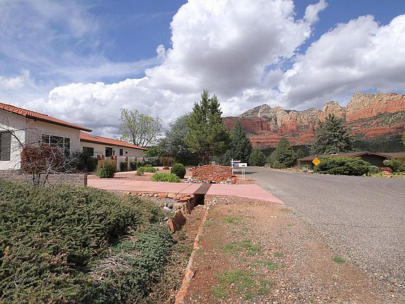 Spanish charm and curb appeal are all on one level in Uptown Sedona. Linger over coffee on the front patio to admire mountain views. Tongue and groove ceilings, and warm brick floors in main living areas lend expansive look and feel as natural light shines in. Updated kitchen offers gas range with granite slab counters and backsplash to take whatever your gourmet touch throws at it. Two bdrms and baths each with ensuites. Master retreat exits to hot tub to heat up the cool nights. Third, smaller room is perfect as office space, hobbies, or short-stay visitor needs. Powder room doubles as laundry room. A bright 20x12 shop space awaits artistic flair or green thumb talents to liven up the backyard. And raised beds beckon seeding for produce or fragrant herbs. Close to action of Sedona.