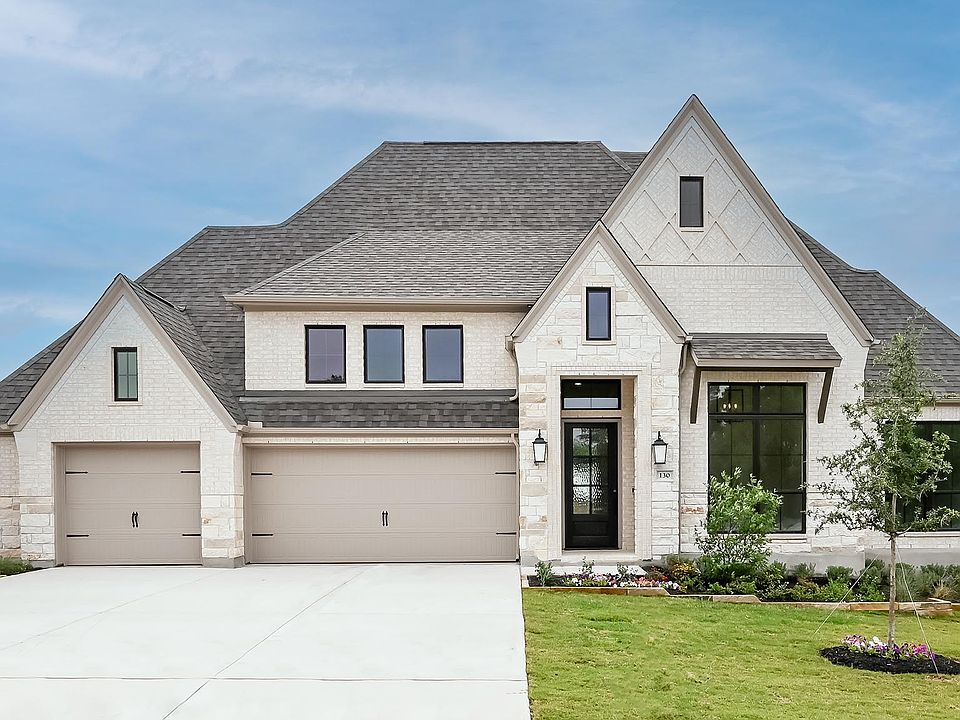 Home office with French doors set at entry with 12-foot ceiling. Extended entry leads to open family room, dining area and kitchen with 16-foot ceilings throughout. Family room features wood mantel fireplace and sliding glass door. Kitchen features walk-in pantry, 5-burner gas cooktop, generous counter space and oversized island with built-in seating space. Game room with wall of windows just off dining area. Primary suite includes bedroom with wall of windows. Primary bath features 11-foot ceiling, dual vanities, freestanding tub, separate glass-enclosed shower and two walk-in closets. A Hollywood bath adds to this spacious four-bedroom home. Extended covered backyard patio with 16-foot ceiling. Mud room off three car-garage. Representative Images. Features and specifications may vary by community.