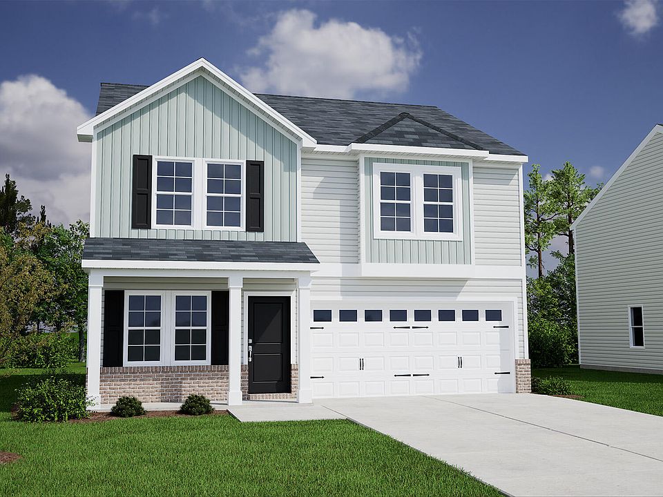 The entryway of this 4 bedroom, 2.5 bathroom home opens to a main floor home office. Luxury vinyl plank flooring leads into the living room and kitchen which features white cabinetry and granite countertops as well as a walk-in pantry. Upstairs a laundry room and a full bathroom are conveniently located near the three spare bedrooms. The primary bedroom features a vaulted ceiling and is connected to its primary bathroom and walk-in linen and clothes closets. The landscaped and sodded yard includes an irrigation system. *Exterior photo is a rendering and not an actual photo of subject property. Home is under construction.