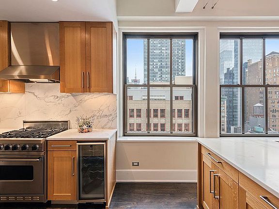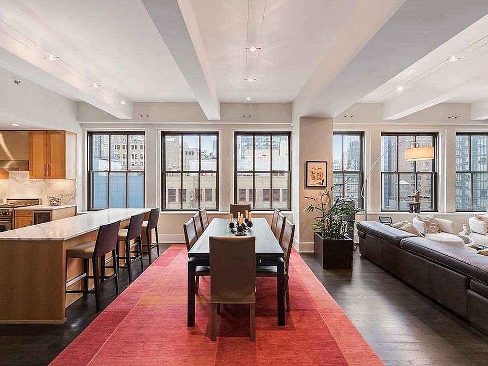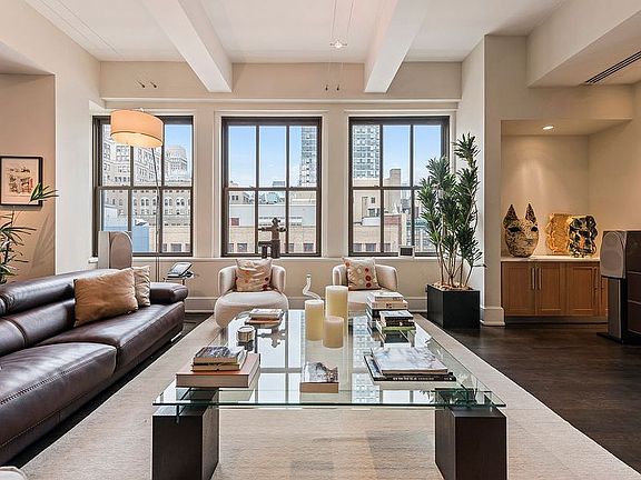 An impeccable duplex penthouse graced with modern lines and a host of high-end finishes, this massive 3-bedroom, 3.5-bathroom condo is a paradigm of urban luxury. Features of this 2,988 sq. ft. home include an open-plan layout, gorgeous dark hardwood floors, airy beamed ceilings rising over 11-ft in height, an in-unit washer/dryer, oversized windows, exposure to the north, east, and south, and a spacious terrace with classic New York City views. Past a roomy entryway foyer and a convenient powder room the home expands into a vast, 45-ft long living and dining area flooded with natural light. The space flows into a wide galley-style kitchen that has been equipped with white oak cabinetry, Calacatta marble countertops and backsplashes, a large eat-in island/bar, and a suite of high-end stainless steel appliances from SubZero and Miele. The remainder of the lower level is occupied by a plush master suite that features northern and eastern exposure, a walk-in closet, and a pristine master bathroom with marble tiles and a windowed walk-in shower. The upper level of the penthouse contains a pair of bedrooms , a washer dryer, as well as an open terrace. Each bedroom boasts private closet space, beautiful city views, and full en-suite bathrooms. The terrace, which can be accessed via the third bedroom or the upper level landing, possesses spectacular city views and is large enough to accommodate several planters and a dining/lounge set. It is the perfect place to entertain or unwind. The land marked Cass Gilbert Building was built in 1928 and was converted into a condominium in 2003. It rises 19 stories and features a doorman and deeded storage lockers. Situated at the northern edge of Chelsea, the building is surrounded by many trendy restaurants, cafes, bars, and shops. It is close to several museums and theatres, and is just blocks away from a half-dozen subway lines.