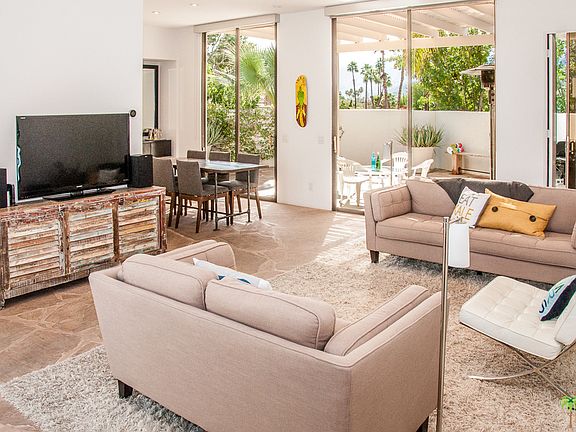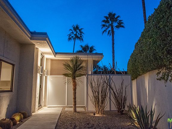 Incredible mountain views from your own PRIVATE POOL and PRIVATE PATIO. This condo features two master suites, a large central living space, 10 foot ceilings with floor to ceiling glass. The AC and furnace was redone in 2013, the pool equipment and heater was redone in 2015. A whole house water filtration system was installed in 2015, dishwasher replaced 2017. This gated architectural complex is very well maintained, and also features a beautiful community pool and spa. FEE LAND. The Club Condominiums were once part of the famous Palm Springs Racquet Club, and during its heyday, the Racquet Club was a hangout for Hollywood stars including Marilyn Monroe, Frank Sinatra, and Elizabeth Taylor.