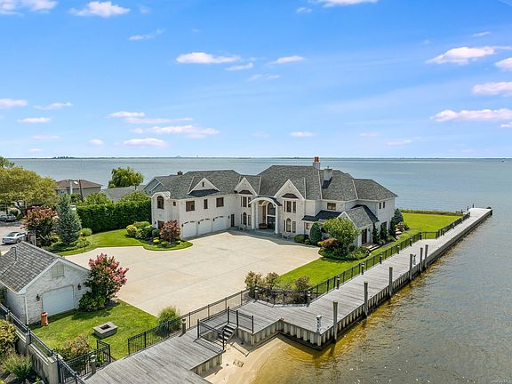 Relax, you don't have to travel all the way to the Hamptons to live the good life, your beachfront paradise is conveniently located right in West Islip! Luxury awaits from the moment you pull into the stately courtyard of this truly magnificent home. Step into the entrance way and be embraced by stunning views of the open bay and the regal beauty of the elegant winding staircase with intricate railings beneath a stunning chandelier. Enter your vast sitting room to revel in the truly spectacular views of the Great South Bay. Step through the French doors, which maximize your view, and walk over the paver patio which stretches across the length of the house and includes a beautiful outdoor kitchen complete with outdoor fireplace and TV setup. Cross over manicured lawns and meticulously landscaped beds and go down to your 200 feet of private beach, put your toes in the sand and plan your next party in this entertainer's paradise. There is both formal and informal living spaces to accommodate any type of gathering you desire. Grab a drink and watch a breathtaking sunset privately from the balcony off the grand primary suite, or invite a crowd and watch from a huge, centrally located balcony. After drinks, take your boat off the slip and head over to Fire Island for dinner. Your guests won't want to leave which is no problem because there is room for everyone to stay over in 8 spacious bedrooms. There is a strong sense of community in the peaceful hamlet of West Islip which makes it a wonderful place to raise a family. There are plenty of fine dining spots, shopping, and historical sites to visit. Easy access to New York City when you want to enjoy city life, it is also ideally located so you can follow the call of the water through activities like sailing, boating, surfing, fishing and more. A boaters and car lovers dream with Your 3-car garage building, boathouse, and 300 feet of bulkhead with ample space for all your toys and gear. The home features Guest quarters with a marble bath. It is not in a flood zone and there are too many amenities to list. Don't let this one get away.