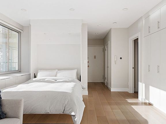 Further down the apartment, you’ll walk into the spacious living room which offers a space for lounging, dining and sleeping. The corner windows give this room an airy feel and with East and North exposures it floods with sunlight (especially in the morning hours) and offers city views as well as a peak of the East River! With a dining nook in the corner, a built-in Murphy bed, and customized closets this room was thoughtfully renovated to maximize the space. The ceilings throughout the entire apartment were also raised during the renovations and installed with recessed lighting throughout. Additionally, owners installed custom motorized electric shades on all windows and built-in HVAC systems controlled by Nest, as well as brand new wide plank, white oak flooring throughout.