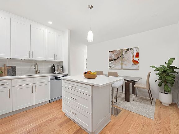 An expansive entry foyer with a large walk-in closet leads to the kitchen and dining area. The brand new kitchen is open to the living room and features custom cabinetry, quartz counters, and high-end stainless steel appliances.