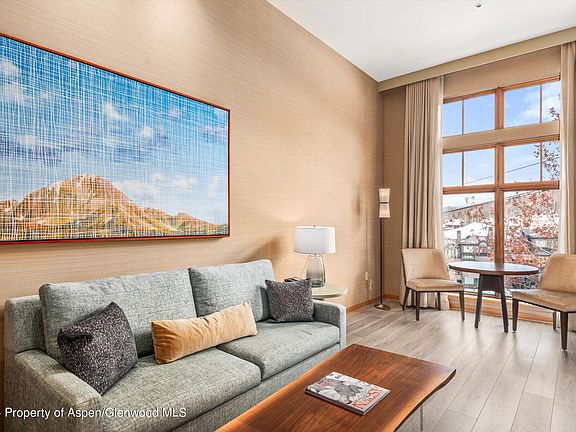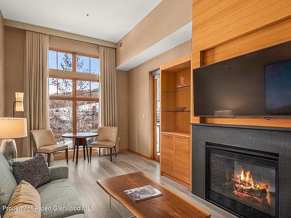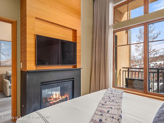 Experience the epitome of mountain luxury in this 1BR/1BA residence at Assay Hill Lodge, Residence 430, boasting a striking 12-foot ceiling and elegant wide plank flooring. Located on the lobby level, this unit provides easy access to the espresso café, concierge service, lounge, and large dining room, ensuring utmost convenience. Cherish the breathtaking slope side and valley views from your private balcony. The home features a streamlined galley kitchen with high-end appliances, a generous bathroom with a luxurious tub, shower, and dual sinks, and a dual-sided fireplace visible from both the bedroom and living room. Additional amenities include a convertible sofa and a multi-purpose dining/work table. As part of Snowmass Village's exclusive 4-star establishment, enjoy a suite of amenities: direct ski access, ski valet & shop, a pool, spa pools, outdoor bar and dining, room service, fitness center, and on site spa.