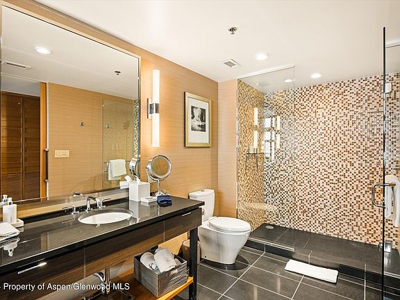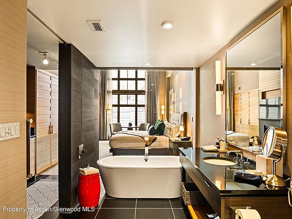 Top floor- oversized studio at Assay Hill Lodge, high ceilings Unit 809. Boasting an impressive 11'6'' high ceiling and expansive views over Cirque, this studio stands out with its additional 60+SF of space, offering a light, airy, and spacious ambiance. The unit features a free-standing tub alongside a separate shower, a kitchenette equipped with a subzero mini fridge, induction cooktop, and convection microwave, ample closet space, and a breakfast table that serves as the perfect spot to savor the views year-round. Without the inclusion of a washer and dryer, this studio maximizes living and storage space, catering to a sleek, streamlined lifestyle. Owners may join the Viceroy Hotel on site rental program. Reside in Snowmass Village's only four-star+ property and indulge in full-service amenities: diverse on-site dining options, in-room dining, a spa, front desk, concierge, valet, and direct ski access among others.