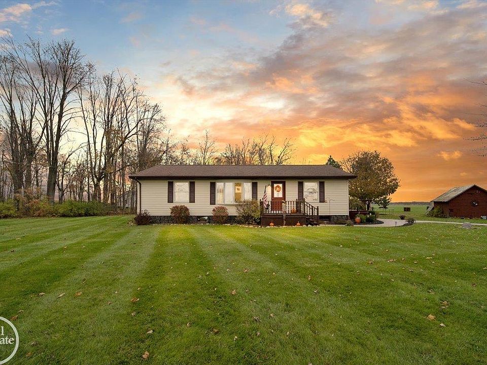 Great home with an Amazing location! This 3 bed 2 bath Ranch sits on a little over 2 acres and backs up to farmer fields for ultimate privacy. As soon as you pull in the driveway you will notice the stamped concrete walking path and Extra Large Garage! The garage is insulated, heated, and has electricity! Inside the home you will find an open floor plan Kitchen, dining room and living room. The master is separate from the additional bedrooms and has its own bathroom! New floor in both bathrooms! The basement is an entertainer's dream boasting polished concrete floors, live edge bar top, barn wood accent wall, painted ceiling, and plenty of room for everyone! This one is a must see!