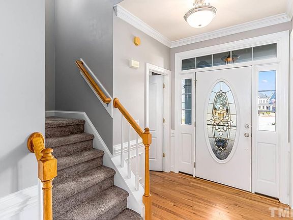 Amazing custom home in Apex with huge fenced yard, located in a double cul-de-sac in one of the most sought after neighborhoods! Come to see this lovely light filled floor plan that features all hardwoods ( yes actual hardwoods!) on main level, family room with Fireplace and custom built0ins, kitchen with granite counter and subway backs plash! Master bedroom w designer colors, cathedral ceiling, huge bonus and office! Come to relax on the deck that looks over a wooded area. New paint inside and out!