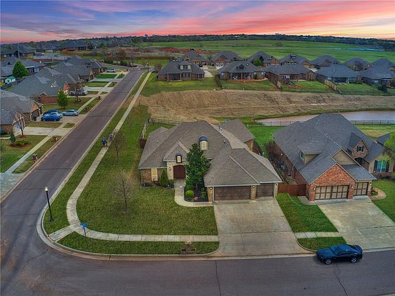This lovely home sits on a spacious corner lot. Upon entering the home, you will be blown away by the stunning archways, crown molding, vaulted ceilings with exposed rafters, and other beautiful custom finishes. The unique floor plan of this home offer four bedrooms, two and a half bathrooms, two living areas, AND a study. The chefâs kitchen is sure to impress with its built-in oven and microwave, gorgeous island, stainless steel appliances, granite countertops, and oversized pantry. The master suite offers a large five piece bathroom with his-and-hers vanities, an impressive walk-in closet, and a private exit to the backyard patio. The backyard is sure to win you over with the expansive deck overlooking the neighborhood pond. Enjoy peace of mind this storm season knowing that this home already has a storm shelter for you and your loved ones. Schedule your private showing today! Call/text us 405-435-5284 to see our video walk-through!