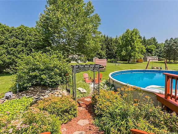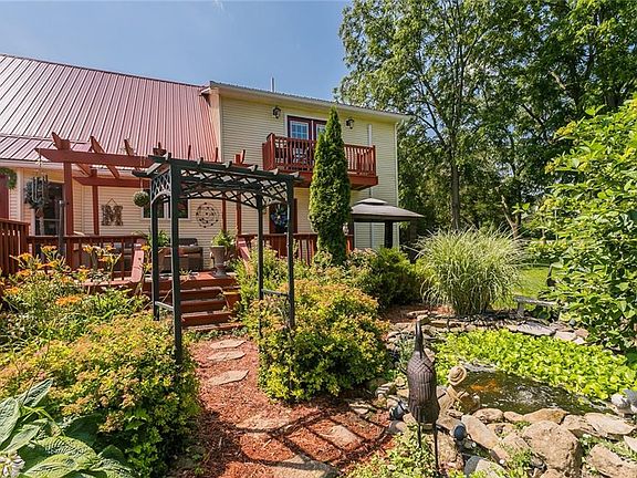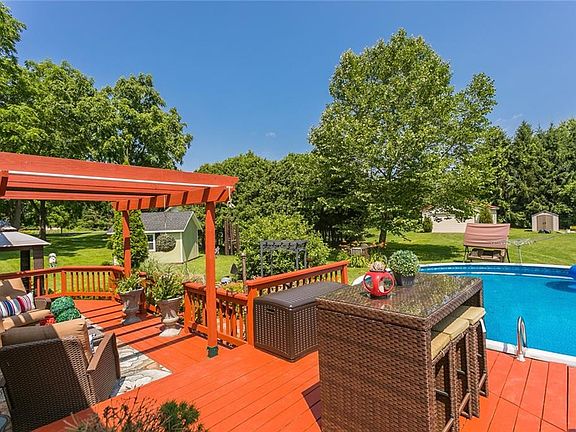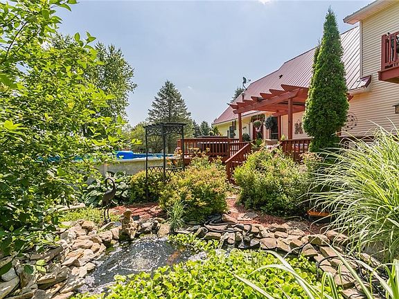 Beautiful Cape Cod south of Brockport on almost an acre of land. This home has everything on your wish list! Inside there are cathedral ceilings, vent free fireplace. Kitchen with granite counters, wine rack and stainless appliances. The first floor has 2 bedrooms and a bath. Upstairs there is a bedroom suite on the right with a full bath. The left side of the loft boasts a Master bedroom with walk in closet, Full bath and balcony! Step out back onto the 2 tier deck with pergola, above ground pool. The Koi pond is 3 feet deep so you can keep them in year round. Garage is heated and cooled. A second 2 car garage with 100 Amp service and shed provide plenty of space for all of your toys. Maintenance free roof, whole house generator. Furnace and AC are new in 2013