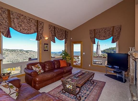 Dramatic open floorplan offers 180 degree views of mountains/front range. Well-designed kitchen has been updated with stylish tile and quartz countertops. High-end appliances, island and desk area make the kitchen both functional and luxurious. Open concept layout includes dining and living areas adjoining wrap-around deck and wall of windows. Main level office shares see-thru fireplace with living rm. Cozy reading loft welcomes you into the upper level master suite that offers gas fireplace and sumptuous bath with corner tub. Lower level offers perfect guest retreat or kid-area. Two bedrooms compliment the family room that offers the 3rd fireplace. Additional deck offers huge vistas and is ready for your hot tub. Lowest level of the home makes for a good hobby or game room and adjoins the large storage area.